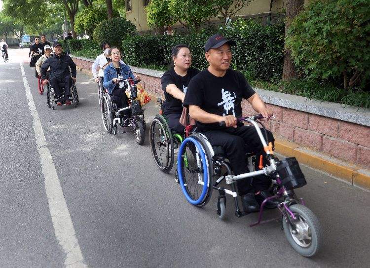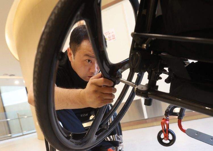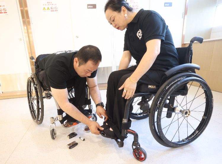 5月16日,李辉帮队友补葺轮椅。