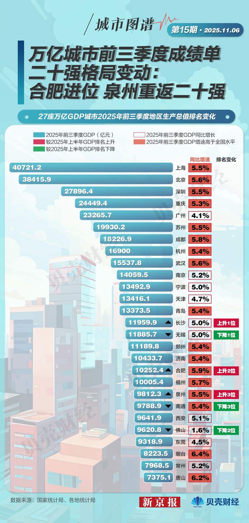 年内,下滑万亿都市“二十强”榜单变更不断:泉州不断两个季度排名回升,都市逾越南通,图谱重新回归前二十行排队伍;南通上半年强势上涨,⑮泉排名较去年年尾提升5位,州重最新三季度增速有所放缓,跌出二十强;合肥不断坚持高速削减,回升2位至第18位;佛山则在二季度跌出二十强后,不断下滑2位,增速为1.6%。