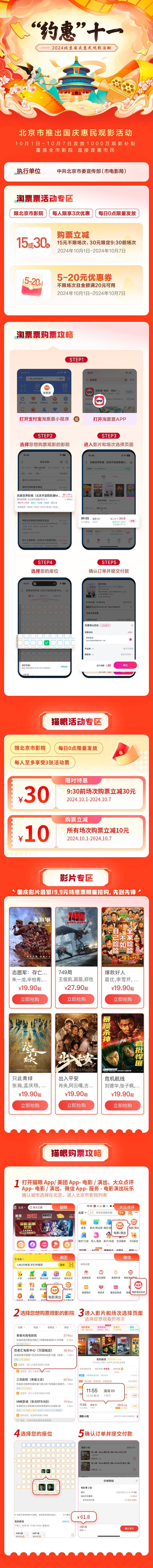 限时特惠是指,市夷易近可享受置办北京市影院9:30前的片子场次时立减30元。经由淘票票APP置办10月1日至10月7日片子票,逐日限量1900份;经由猫眼APP置办10月1日至10月7日片子票,逐日限量3000份。