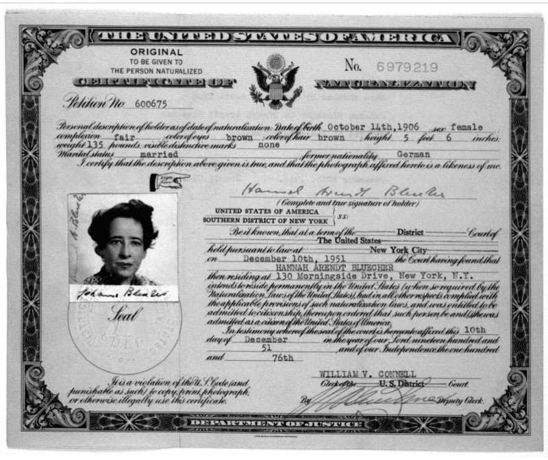阿伦特的入籍证实(Hannah Arendt Papers: Family Papers, 1898-1975; Arendt, Hannah; Naturalization (birth, marriage, death, divorce, and miscellaneous family documents); 1940-1952, undated)。