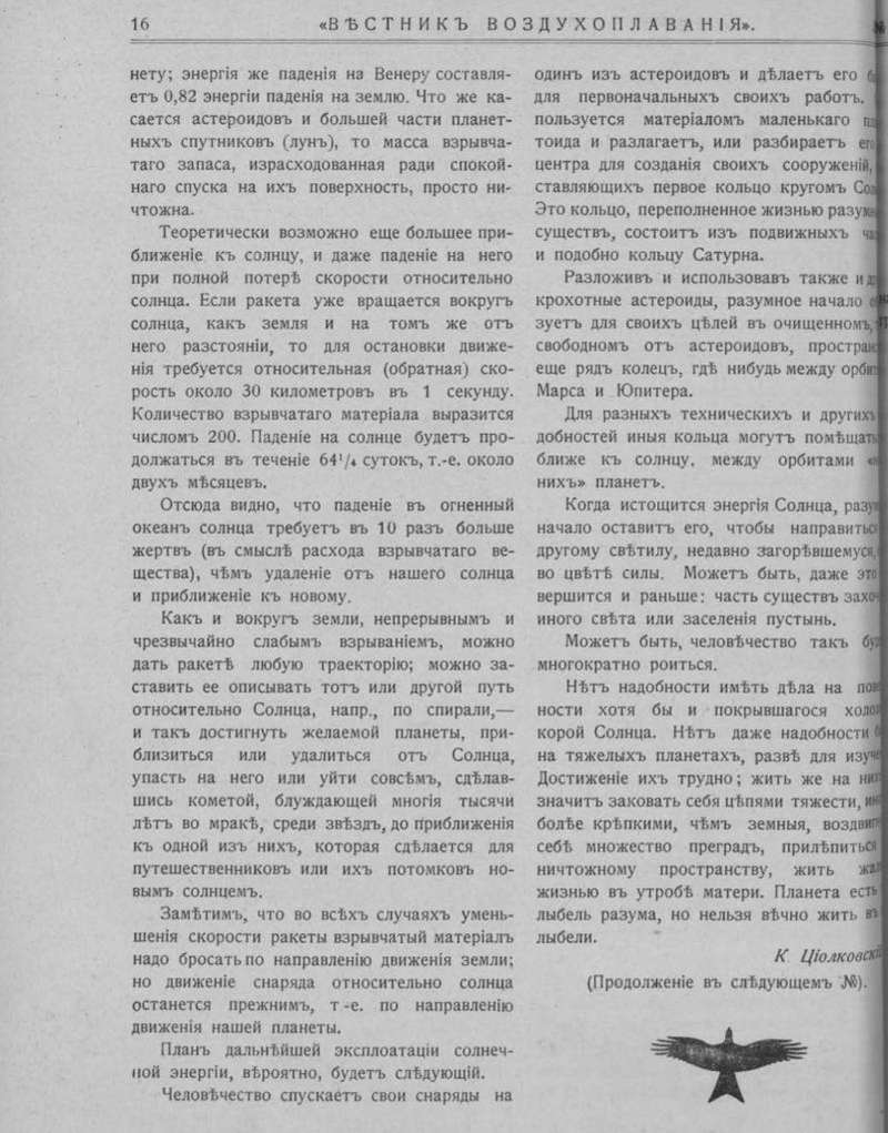 齐奥尔科夫斯基在此文开始说道:“星球是心智的摇篮,但心智不能总在摇篮里”。(Циолковский К.Э. Исследование мировых пространств реактивными приборами // Вестник воздухоплавания. 1912. № 3. С. 16)。