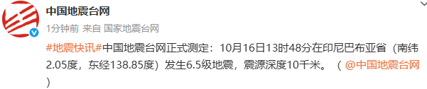 最新往事讯 据中国地震台网正式测定:10月16日13时48分在印尼巴布亚省(南纬2.05度,印尼亚省源深东经138.85度)爆发6.5级地震,巴布爆震源深度10公里。震震