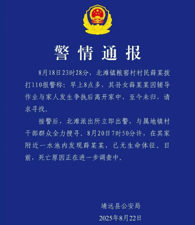 ▲警方就女孩薛某某离世一事宣告传递。图/靖远公安
