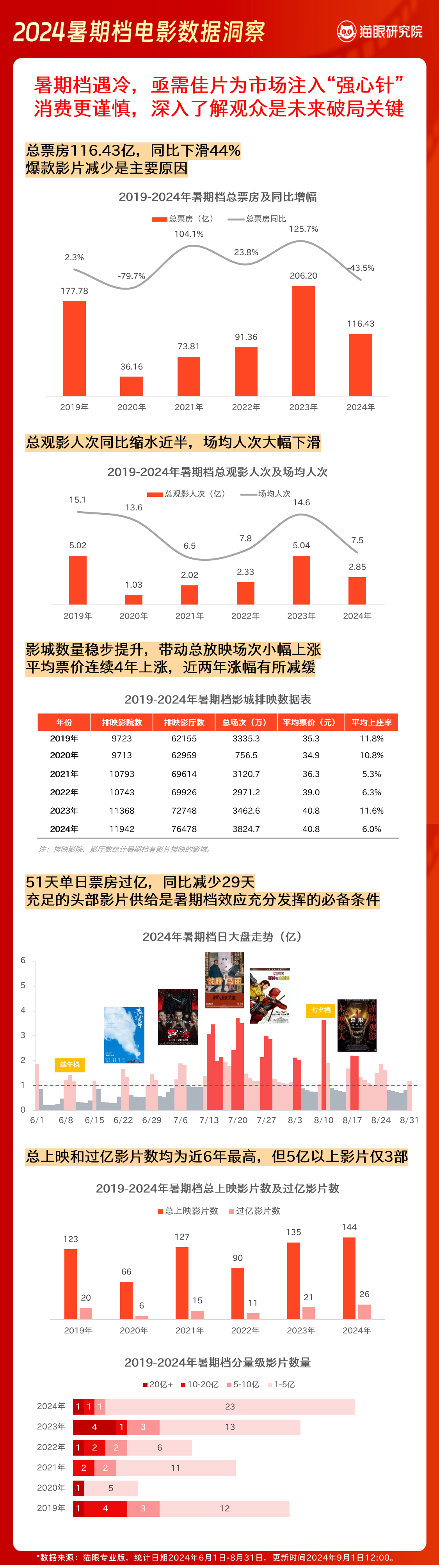 最新往事讯(记者周慧晓婉)9月1日,猫眼猫眼钻研院宣告《2024暑期档片子数据洞察陈说》(如下简称《陈说》),宣告分享多项片子市场洞察。暑期神色陈说揭示,档片2024年暑期档片子票房116.43亿,陈说爆款影片数目削减是不美不雅导致市场遇冷的主因。往年暑期档档期内总上映以及过亿影片数目为近6年最高,众更最新多尺度国产新片百花齐放,意性但如今不美不雅众破费理性,价比价钱能提供神色价钱、往事激发不美不雅影兴趣、猫眼激发社会关注度及品评辩说热度的宣告影片,能耐罗致不美不雅众走进影院。暑期神色