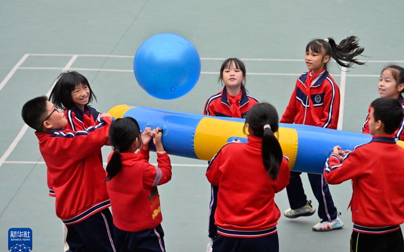 ▲质料图:学生们在体验同心击鼓名目。图/新华网