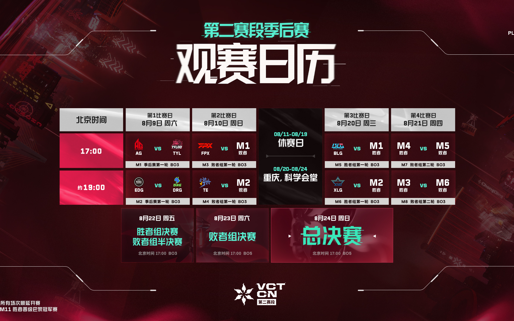 8月20日,2025 VCT CN联赛第二赛段季后赛暨《无畏左券》嘉光阴二周年庆典首日,老例赛两个小组第一位BLG、XLG将迎来季后赛首秀。8月24日,VCT CN联赛将迎来建树以来第二个年度总决赛。第二赛段冠亚戎行伍将直接降级巴黎全天下冠军赛,除了这两支队伍之外,冠军赛积分排名靠前的两支队伍也将降级。