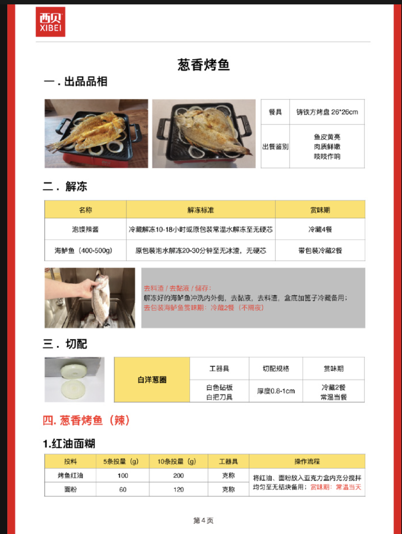 9月12日,西贝宣告《致主顾的一封信》,果真13道菜品的“作业教育书”。这些菜品的制作流程提到,羊排已经预切割,海鲈鱼、大黄鱼等已经由宰杀、处置过内脏并冷冻,到店后解冻,大黄鱼注明“现烤现用,不可延迟预制”。此外,羊肉串防止预烤;牛肉马铃薯条所用牛肉为预处置丝状并延迟腌制;鸡汤白玉山药炖豆腐中的鸡汤,由“丰姿鸡汤”、鸡粉以及水兑制而成;黄米凉糕为店内现制;羊排、羊腿、羊棒凭证当餐定单现煮现烤。