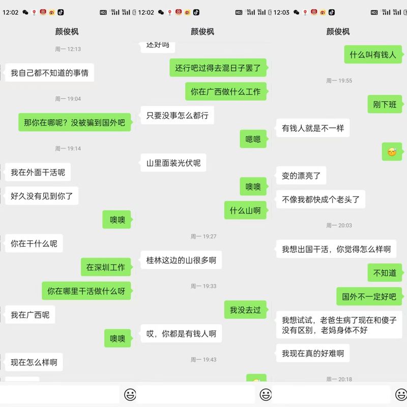 最后一次与“颜十六”分割上,是王星使命掀起行动风波之后。许思思说,“颜十六”有两个微信号,用来招人的微信号已经无人回覆,1月6日,“颜十六”用另一个微信回覆许思思说,自己被盗号,招人去泰国的使命与自己无关,他说自己如今广西的山里装光伏,并提及“老爸病了如今以及傻子不差距,老妈身段欠好”,“想出国干活”。尔后,许思思再未分割上“颜十六”。