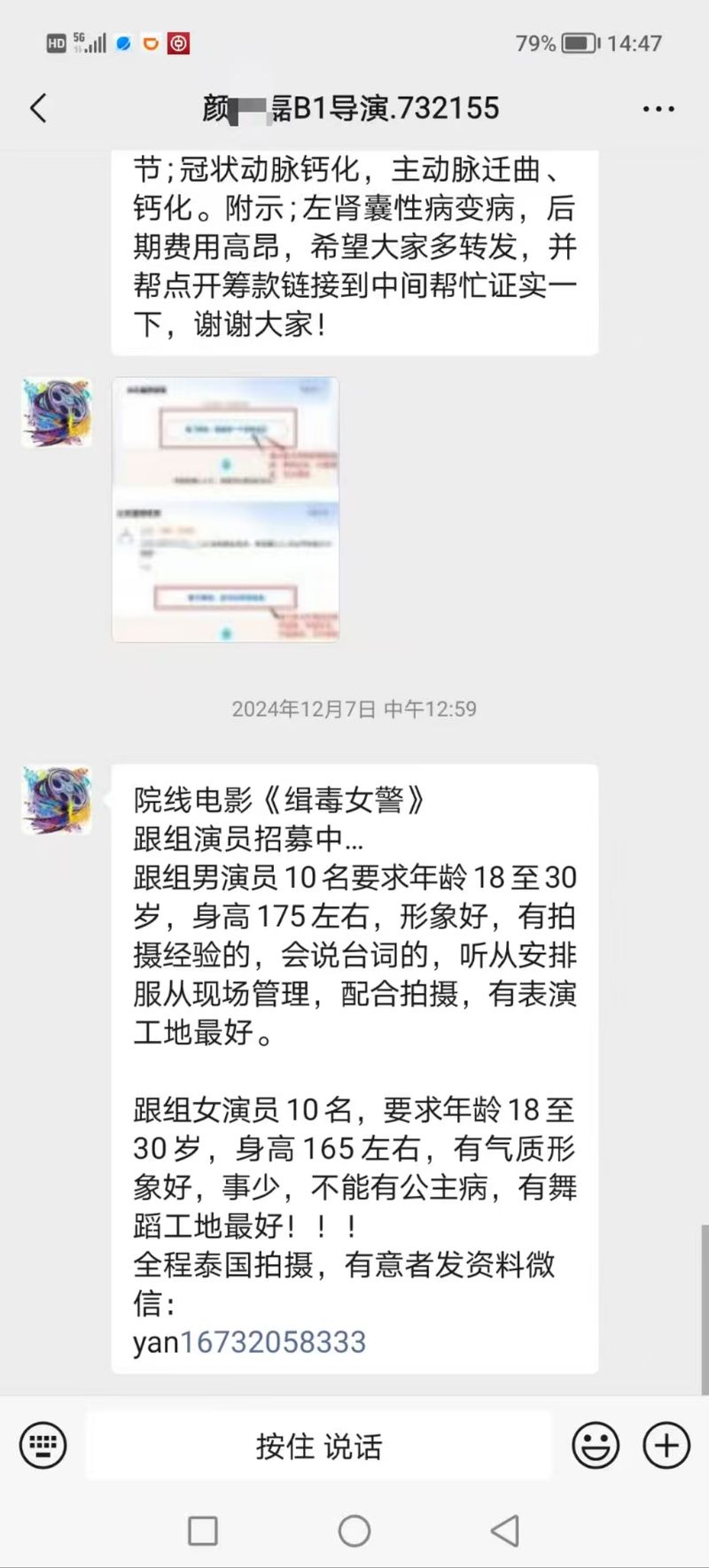 业内人士收到的“颜十六”发来的招募演员信息。受访者供图