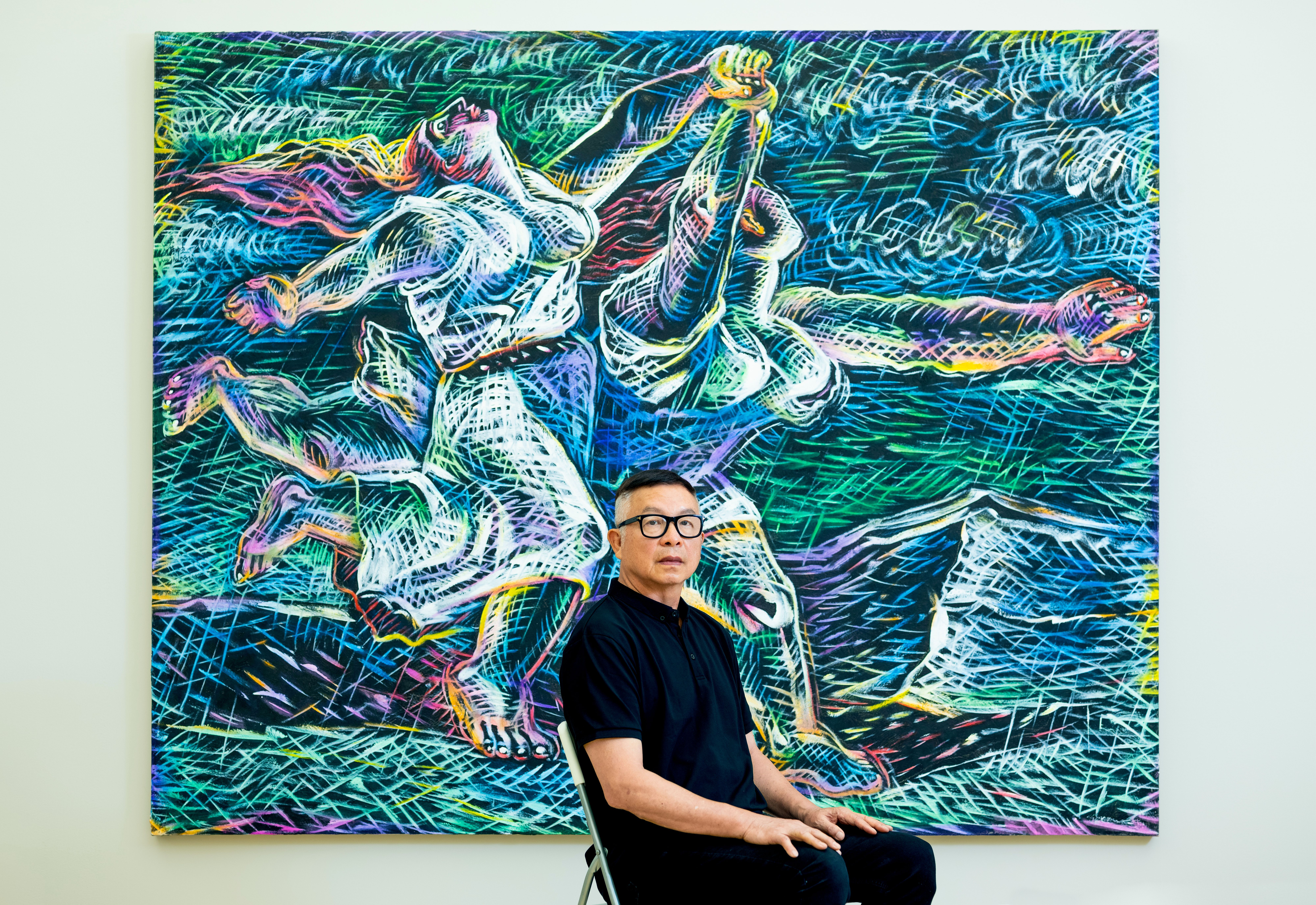 《他乡组画-接力》,布面油画,200 × 180 cm,2007。 今世唐人艺术中间供图