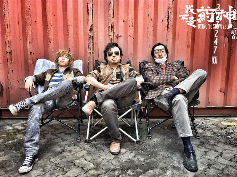 王传君(右)与片子《我不是药神》主演章宇(左)、徐峥(中)在影片拍摄现场。