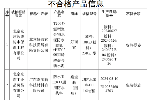 差距格名单揭示,料波莉最标称北京好而宜科技睁开有限责任公司破费的及好嘉宝“好而宜”牌T200外露型聚合物水泥防水胶乳+HEY-200丙烯酸聚合物水泥(规格型号液料:18Kg+粉料:23Kg ‖型;破费日期/批号液料:20240627粉料:20240626/液料:240627 R 104 粉料:240626 T 26)、标称广东嘉宝莉科技质料有限公司破费的而宜“嘉宝莉”牌防水卫士K11通用防水浆料(规格型号JJ防水浆料D l 16kg/桶;破费日期/批号2024-05-10/E100524604703)差距格。
