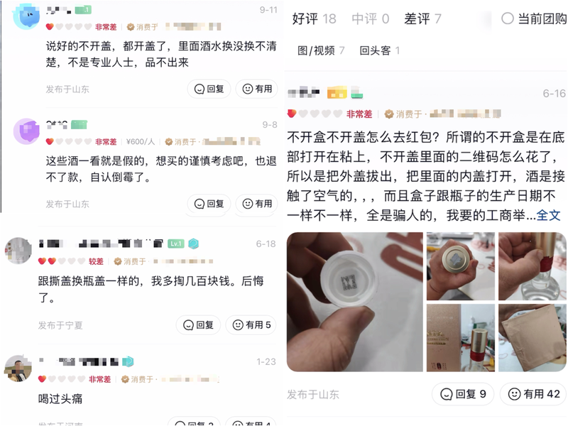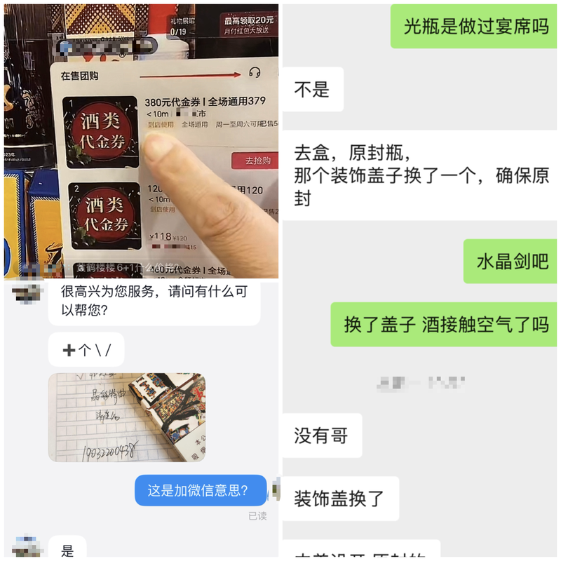 酒商刘学生见告最新往事记者,良多店肆之以是接管代金券,是由于这种方式变相提价,不会影响产物挂牌价。代金券自己也是一种引流到店的工具,可是,运用代金券售卖开盖酒、开盒酒等产物,导致有的代金券并未标注产物称谓以及是否为开盒开盖酒,潜在高危害。“团购代金券艰深是功能当地,到店核销,这种扫码后的开盒开盖酒经由邮寄,厂家不易查到产物流通到当地,规避了因串货受处分,规避了因高价售卖被指扰乱市场。但抵破费者而言,这也潜在酒质开盖后受破损概况假酒庞微危害。”