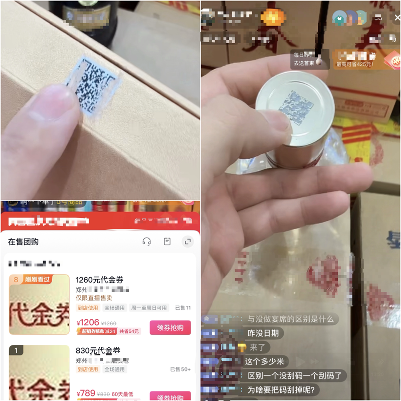 某直播间主播在回应所谓做过宴席的高价酒与原厂包装酒的差距时,主播手指被刮花的二维码以揭示差距。某电商平台直播间截图