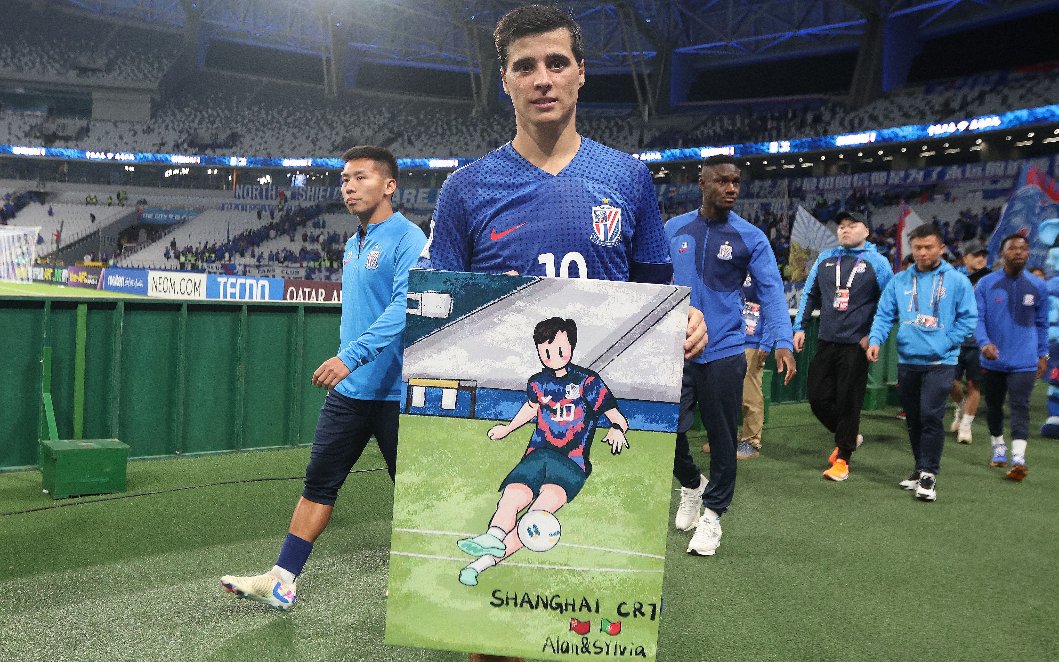 申花外助特谢拉赛后收获球迷留念礼物。 图/IC photo