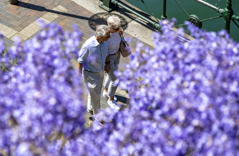 2022年11月7日,在澳大利亚悉尼,人们从蓝花楹树下走过。新华网记者白雪飞摄