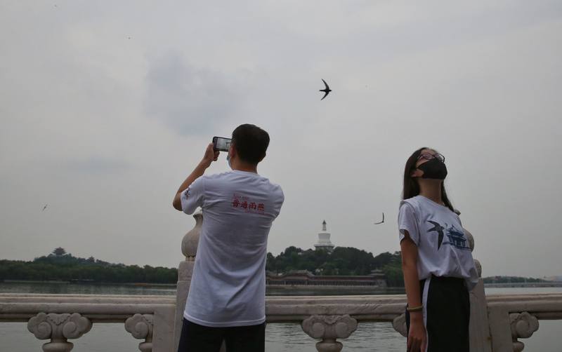 7月11日,北海公园,被迫者白涛(左)以及北北(右)在五龙亭审核雨燕。白涛用手机拍摄照片,合计雨燕数目。最新往事记者 薛珺 摄