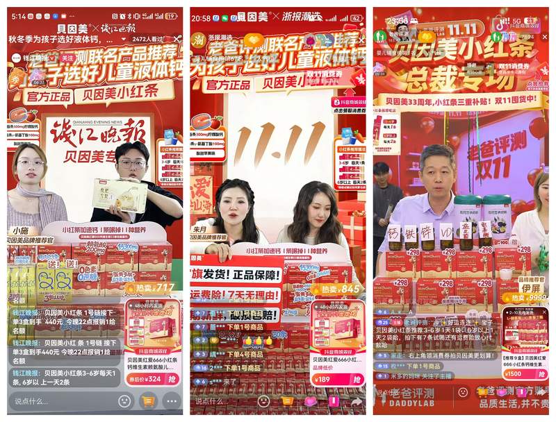钱江晚报、浙报传媒、老爸评测--双11直播现场,配合推选贝因美小红条液体钙。企业供图