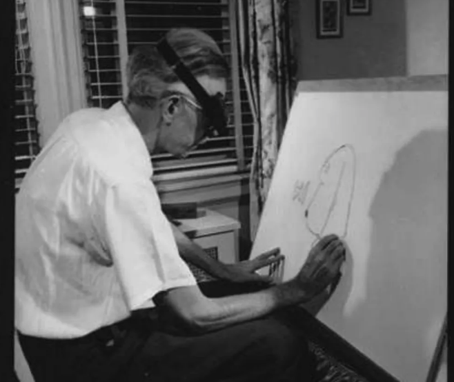 瑟伯借助头戴式扩展镜在纸上作画。