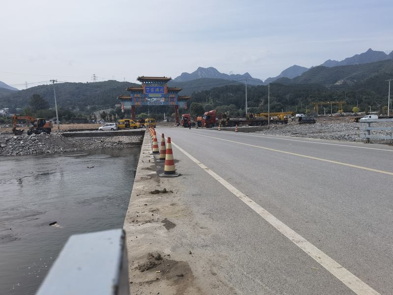 沿109一起西进,一座跨过永定河的桥,衔接着国道109以及丁家滩村落子,桥西即是丁家滩村落子的牌楼,这座牌楼未已经被急流冲垮,但双侧受损严正。