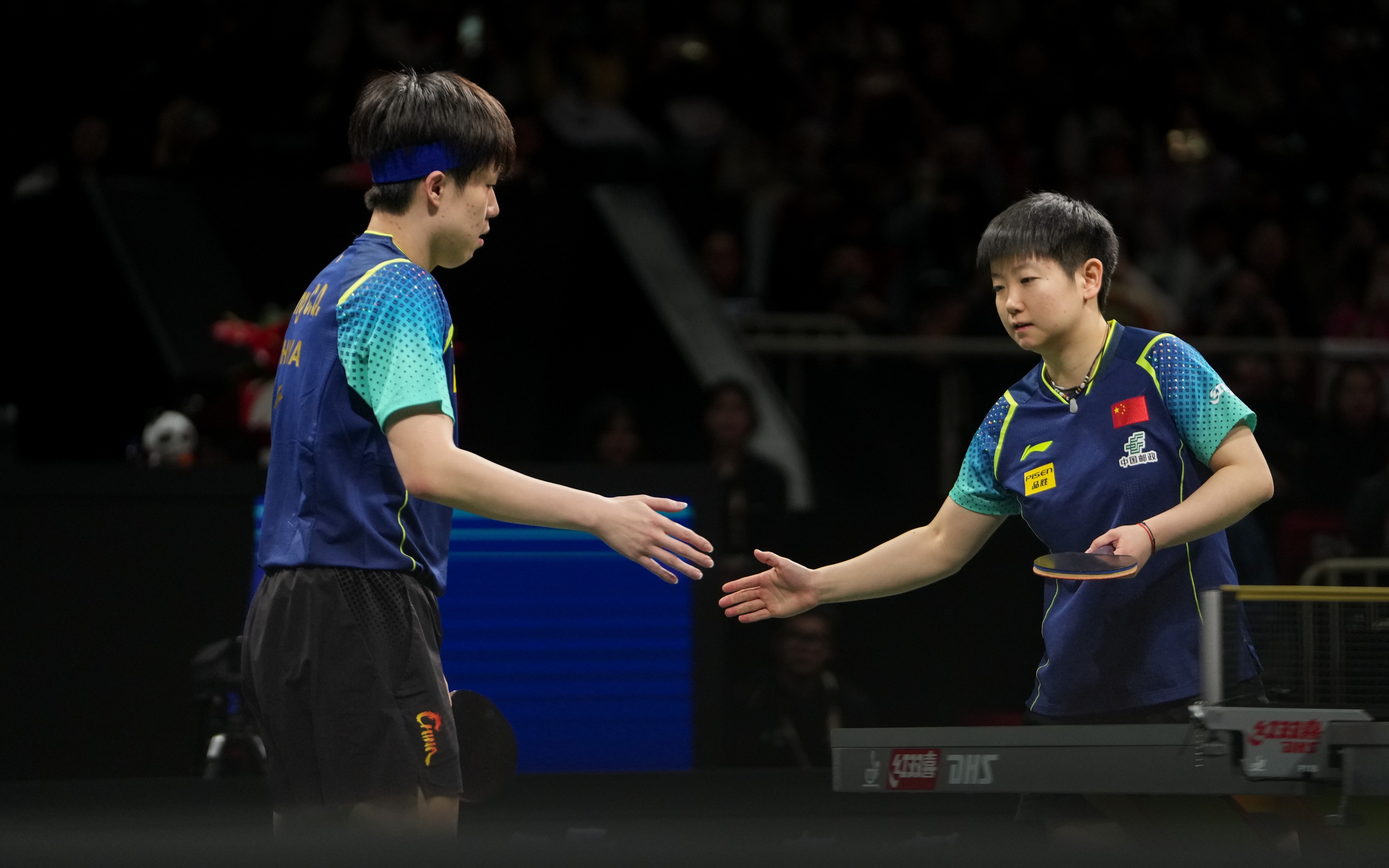 王楚钦/孙颖莎(右)击掌贺喜,他们以3比0战败中国香港队组合姚钧涛/吴咏琳。组合逐感 图/新华网
