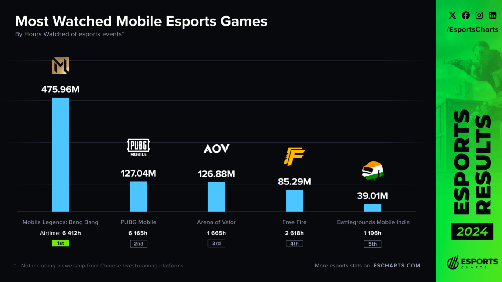 尽管与PUBG Mobile相似,2024年的总旁不美不雅时长较2023年略有上涨(主要受到相同市场因素的影响),但这一数据变更并不影响《决胜高峰(MLBB)》在挪移电竞行业中的中间位置。据Esports Charts预估,《决胜高峰(MLBB)》稳居全天下挪移电竞旁不美不雅量第一的位置,而且短期内简直不可能被任何相助对于手撼动。