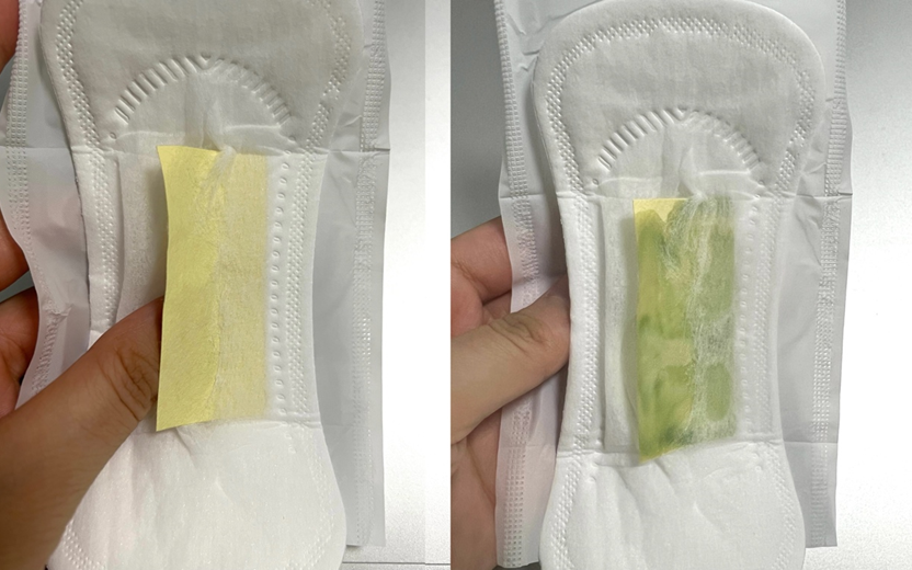 ▲记者向护垫中部滴纯挚水,“检测芯片”很快由浅黄色酿成绿色。自检自媒主忽最新往事记者 罗艳 摄