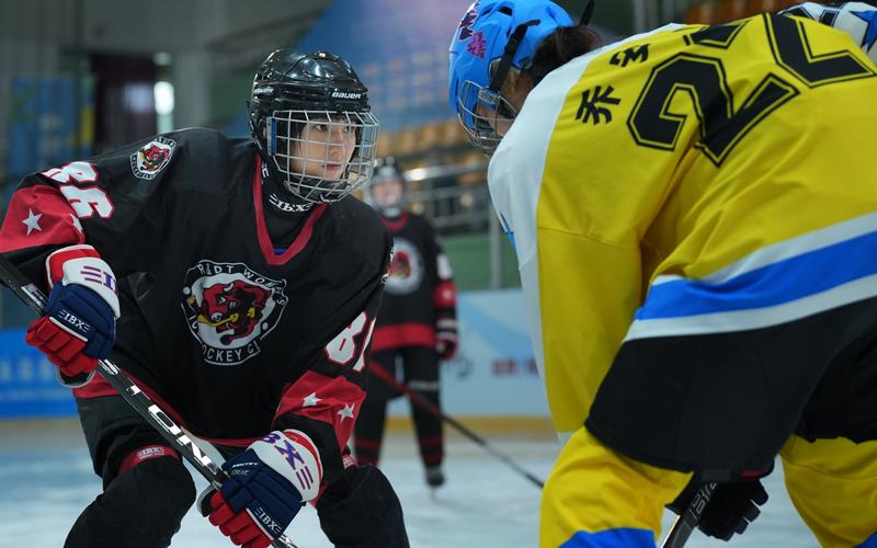 片子《再也不退缩》主演侯佳音在冰球赛场上与对于手比拼。