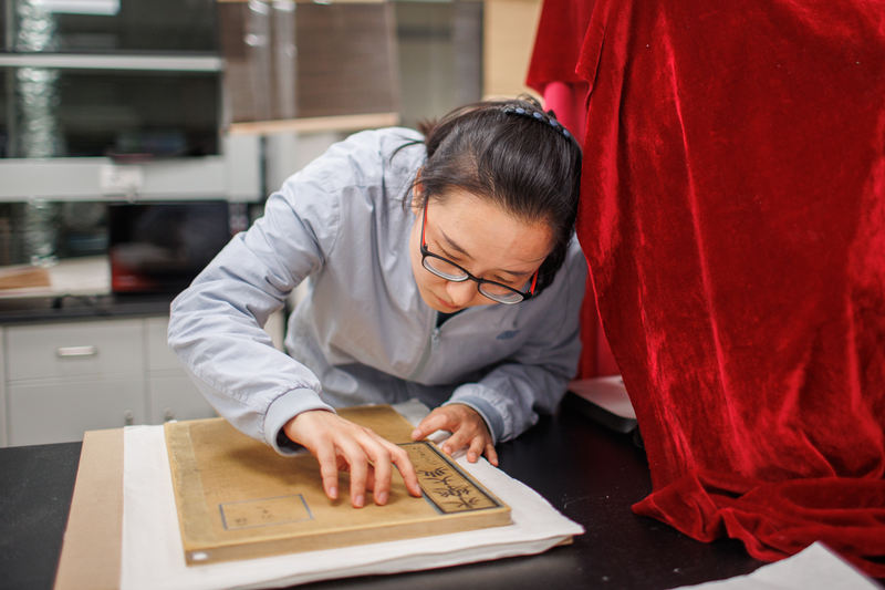 宋晶负责书芯的修复,据她介绍,以往在修完书叶会有“锤平”的步骤,即在不同个位置存在破损,“搭口”垒患上较多,需要用锤子偏远把它锤上来。他们这次修复接管了双层薄纸,省去了锤书的步骤,摸下来自摸也不太大高下感。