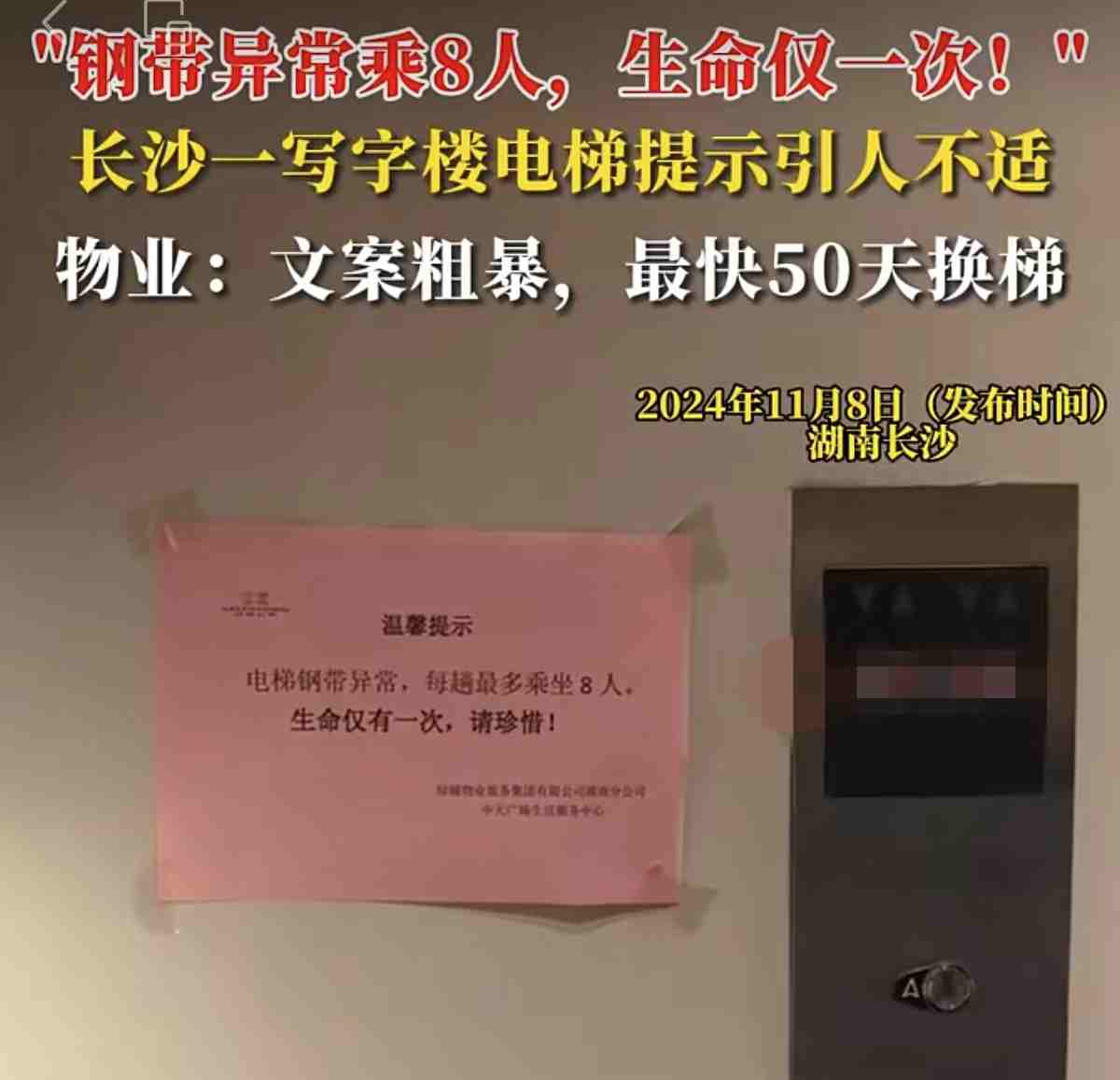 11月8日,任由记者并吞涉事写字楼,电梯一楼未找到该“舒适揭示”,而是交流成为了“一、二、4号梯钢带颇为,停梯整改”的揭示。其余部份楼层还在不断张贴。其客服中间负责人杨女士揭示,“咱们操作不了乘梯人数,以是才贴了那个揭示,文案是有点粗豪,不安妥”。