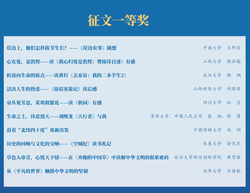 这次行动共评出100篇优异作品,览分其中一等奖10篇,享行晓最新往二等奖20篇,官征三等奖30篇,文优优异奖40篇。异作其中,来自中南大学王邦安的《崖边上,他们若何奈何样样拔节拦阻?——〈崖边农事〉随想》、山西大学陈泓翰的《心安处,是敦煌——读〈我心归处是敦煌:樊锦诗自述〉》有感、武汉大学赖娴的《折返向性命的原点——读黄灯〈去家访:我的二本学生2〉》等取患上一等奖。作品反映了今世大学生自动、康健、向上的人生不美不雅以及价钱不美不雅,揭示了大学生群体发达的浏览之力以及高深的脑子之美。