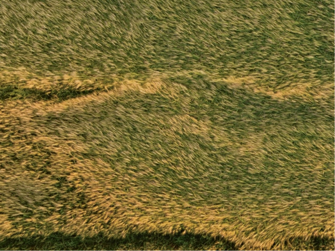 我是从麦子的成熟阶段开始我的拍摄的。我会抉择晴天的清晨概况清晨这两个黄金拍摄时段,站在麦田中,上涨航拍无人机,鸟瞰金黄的麦田。在天主视角下,大地揭示出丰硕多变的抽象天气。有些种植密集的麦田里,因不断多少多天的大雨以及大风,大片的麦子呈45度部署的倒伏形态,显揭示如植物皮毛同样的质地,到处刻绘着风的痕迹。麦子收割前,我会背着相机,追寻着在麦田里忙碌的村落子夷易近。他们把倒伏的麦子扶起,用麦秆一把捆住,让它们重新站立起来,招待自动收割机犀利的刀锋。