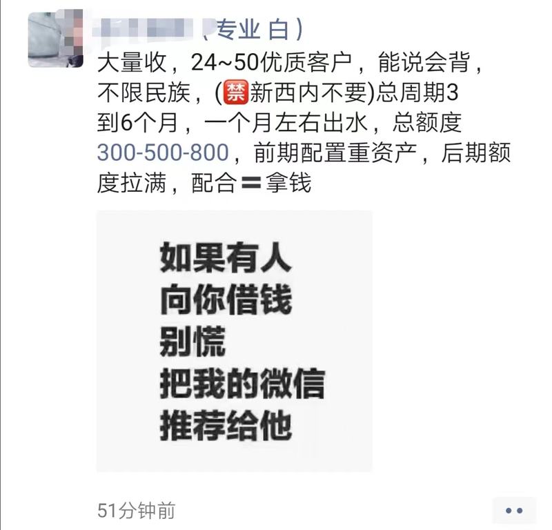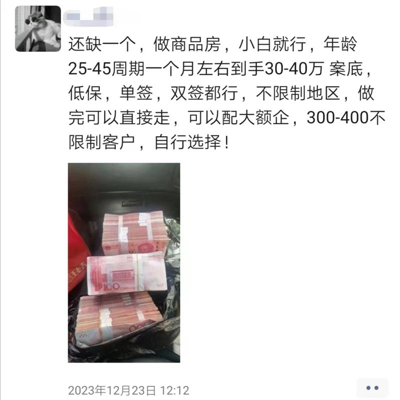 “直背400(万),纯白户、花户都行,年纪25到45岁”“做商品房,一个月患上手40万,前期可能配大额企业,300(万)到400(万)”。2023年12月尾至往年1月初,蓝旭东每一隔多少多天,就放出一条相似的往事:“年前最后一批,遇上能过个肥年。”